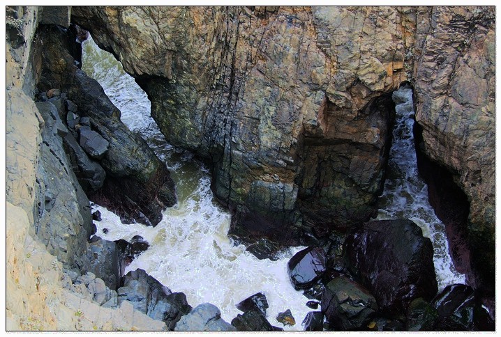 下图是著名的海蚀竖井“仙人井”。四周悬崖包围,宛若一口深井,高度约四十几米,井底有三个洞,涨潮时海水汹涌灌入,气势非凡。这三个洞都是因为海水侵蚀而自然形成的。