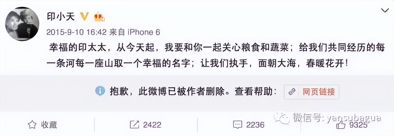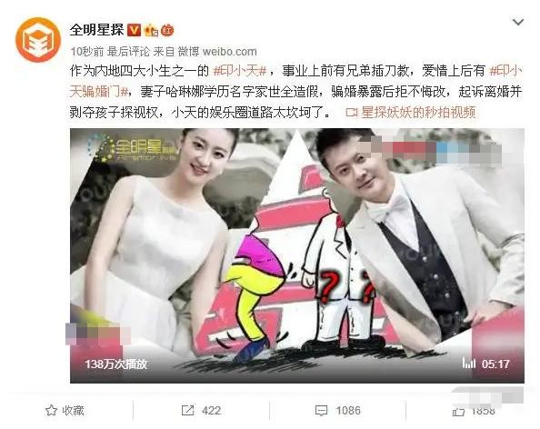 最终这场收获无数祝福的婚姻,仅维持了一年半,印小天虽然得到了女方的道歉,却失去了孩子的抚养权。还要支付女方350万的财产分配,以及每个月1.5万抚养费。