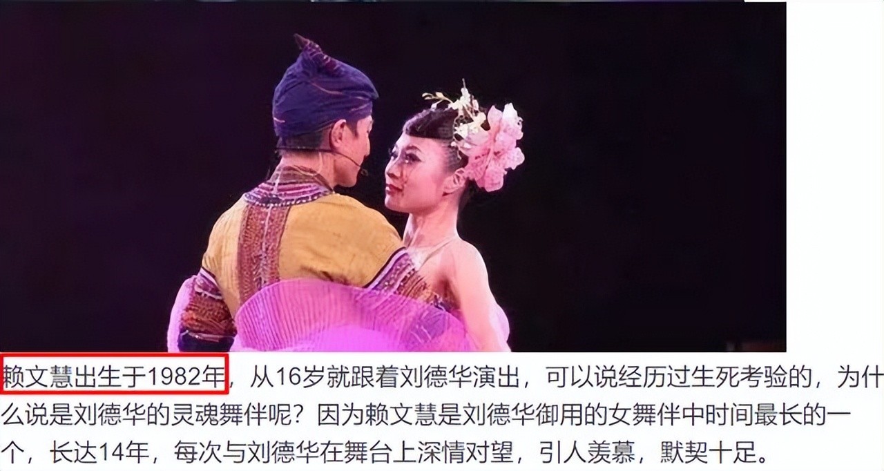 刘德华作为一个能唱能跳的歌手,他对舞伴的要求也很高,舞伴几乎处于固定人选,没有特殊情况一般不会换,坊间传闻称,在赖文慧之前,有一个女生是刘德华的御用舞伴,在某次演唱会登台演出之前,女舞伴气哄哄的找到刘德华舞蹈团队的负责人,大喊一声“你们给的工资太低了,我不干了!”