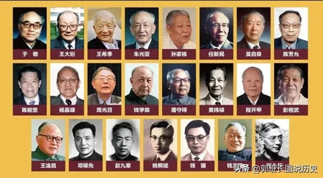 于敏、王大珩、王希季、朱光亚、孙家栋、任新民、吴自良、陈芳允、陈能宽、杨嘉墀、周光召、钱学森、屠守锷、黄纬禄、程开甲、彭桓武、王淦昌、邓稼先、赵九章、姚桐斌、钱骥、钱三强、郭永怀。希望国家能把这23位院士的头像和事迹张贴在学校墙上,地铁上,还有大街上,活动场上,运动场上,把那些明星的照片,换上他们,让大家都记住这些英雄,是他们让我们站起来了,不再受到外敌欺负!