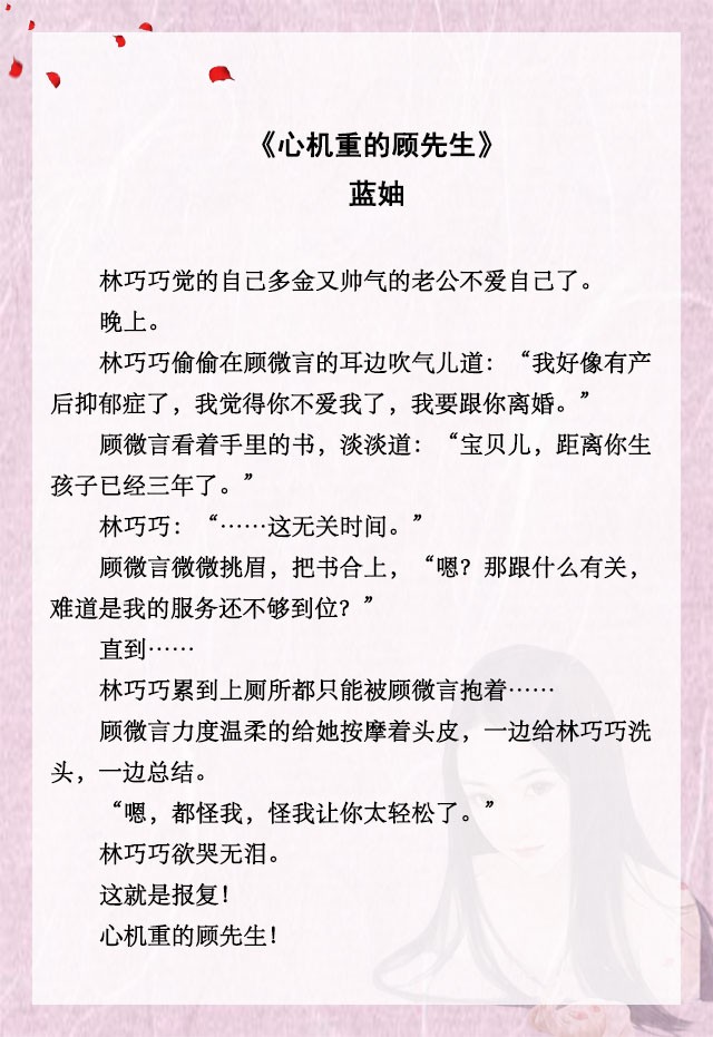 短评:现言小甜饼,都市婚恋,心机男主,平淡温馨。男主有钱有颜,钱钱多到花不完,外表帅破天际,同时心机重有点小心眼,因为有精神洁癖所以很专一,对女主百般疼宠。女主内心戏丰富,脑回路清奇,稍微有点沙雕,在男主面前是撩人的小妖精。主要讲述男女主婚后的甜蜜日常,剧情稍显平淡,肉肉蛮香的,可以阅读。
