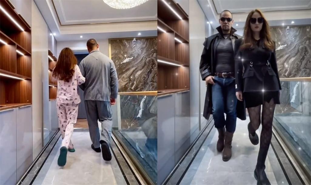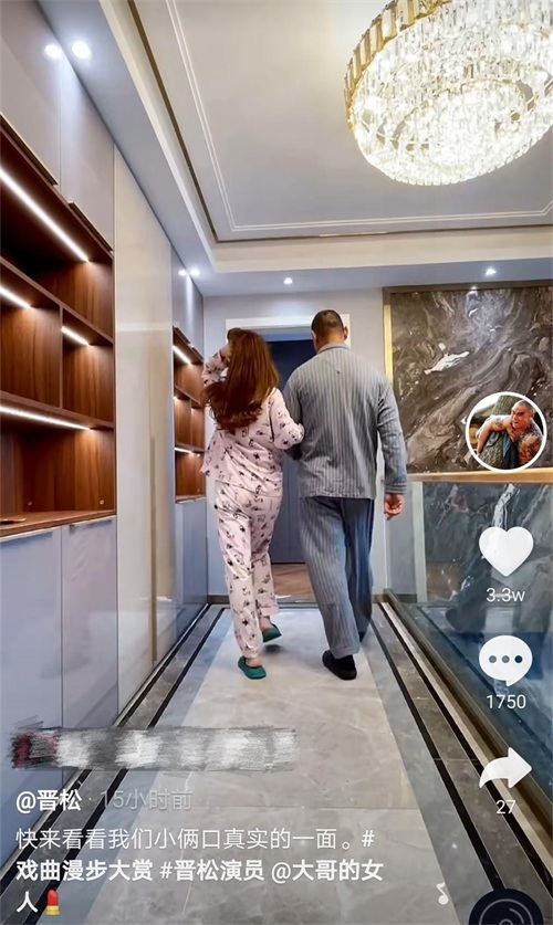画面中,两人分别穿着成套睡衣,脚踩拖鞋,手挽手在走廊上边扭边走,妻子李汶桐还揉了揉秀发,慵懒十足,仿佛一场睡衣秀。