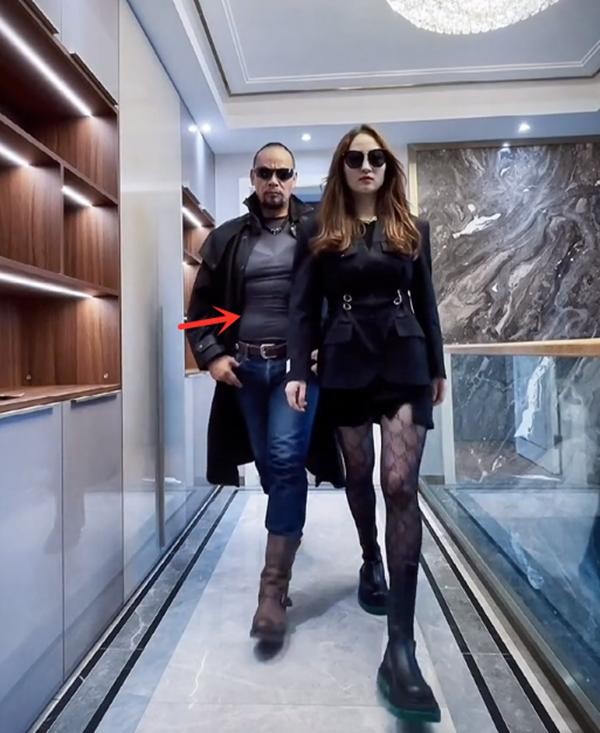 晋松穿着长风衣,走路时衣服随风摆动,相当有气场,不过他的紧身衣太吸睛,印出来的不是八块腹肌,而是双层肚腩,发福的身材配上他脸上的法令纹和胡子,略显老态。
