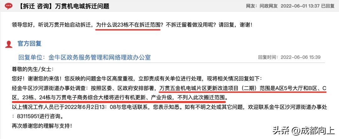 今年6月有人询问,为什么(万贯)23栋不在拆迁的范围?牛牛回复:23栋将进行有机更新、产业升级,不列入此搬迁。