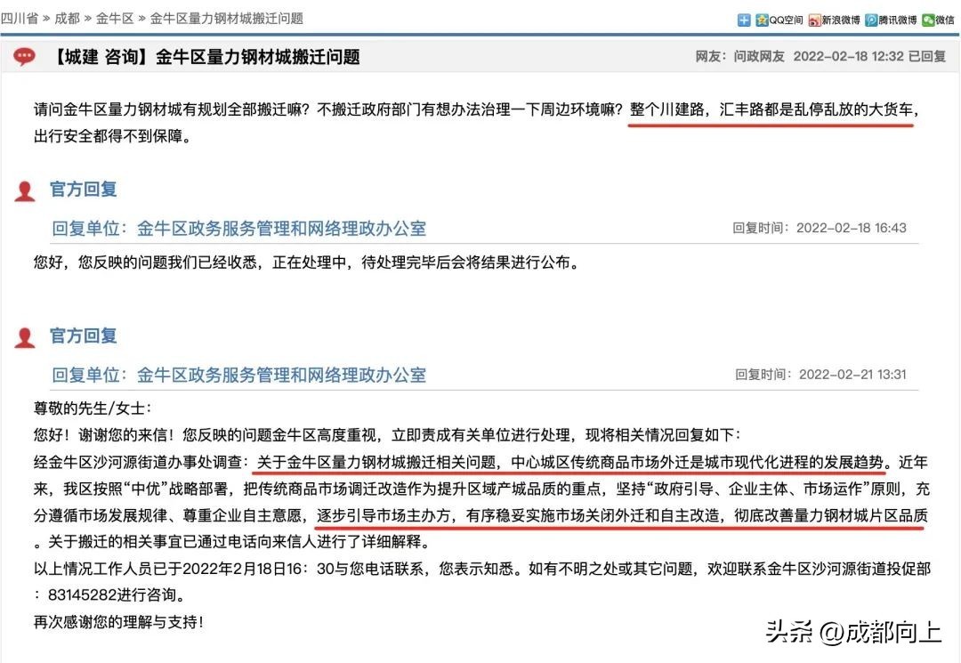 今年2月,有人询问量力钢材城的搬迁问题。金牛回复:中心城区传统商品市场外迁是城市现代化进程的发展趋势,目前量力钢材城正有序关闭外迁和自主改造。