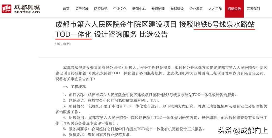 哎呀,这是要搞TOD的节奏啊?在今年4月,成都兴城官网上公布了一份招标公告,其中就明确提到了地铁5号线泉水路站TOD一体化。两个字:稳了!