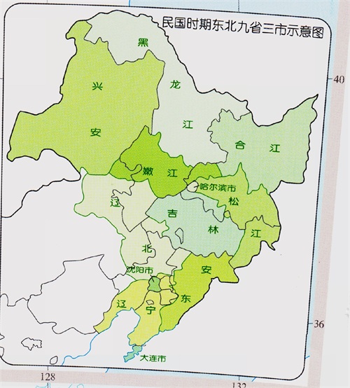 抗战胜利后,东北地区被划分成黑龙江省、合江省、嫩江省、松江省、安东省、吉林省、辽宁省、辽北省、兴安省;哈尔滨市、沈阳市、大连市共九省三市。