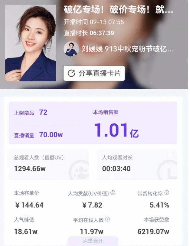 就在刚刚过去的9月13日,刘媛媛当天的直播带货销售额就超过了1.5个亿!所有质疑或批评她的人,是不是该算算刘媛媛帮多少厂家度过难关,又让多少消费者获利呢?
