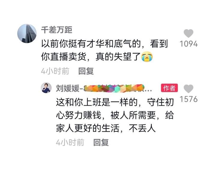看到这些质疑刘媛媛并不生气,反而耐心地解释说:我做直播带货和你上班是一样的,守住初心努力赚钱,被人所需要,给家人更好的生活不丢人。