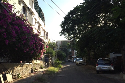 走进新德里的小区,给人的感觉环境卫生各方面都还不错,墙上鲜花盛开,路边停靠着的私家车,一旁的小树林郁郁葱葱,生活在这里的人大多也都是一些精英白领。