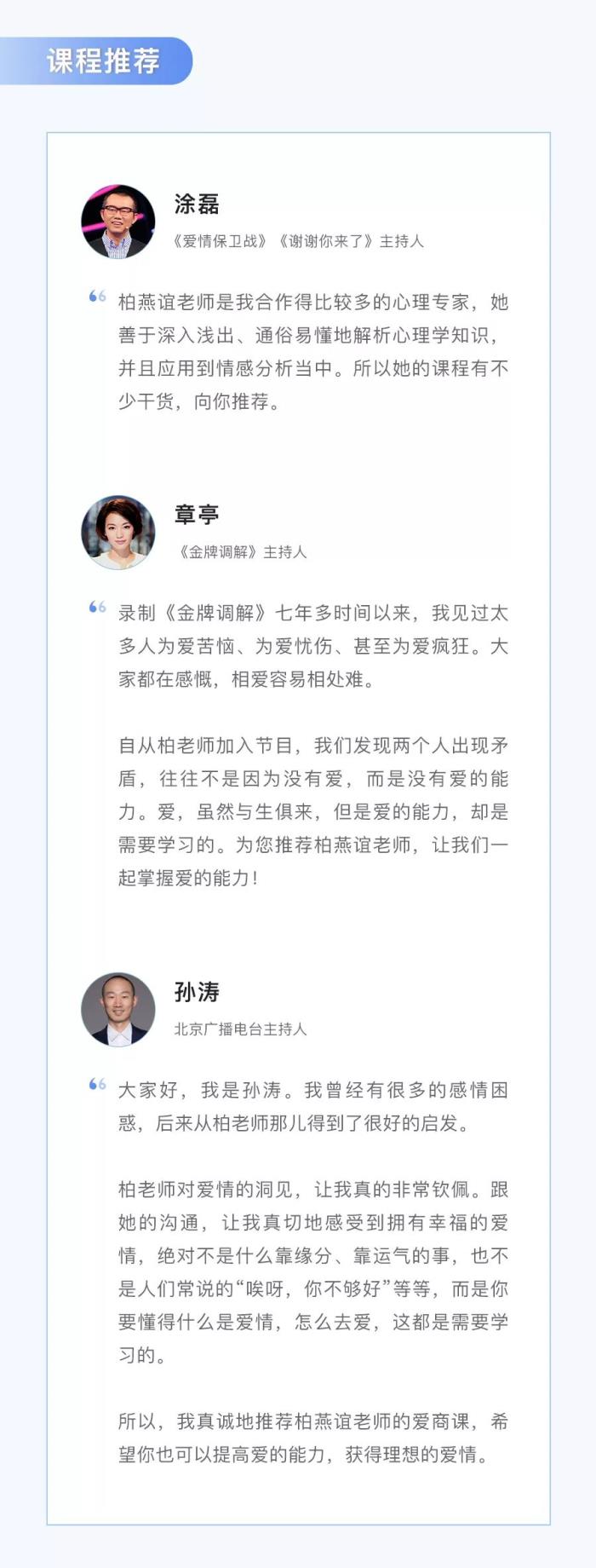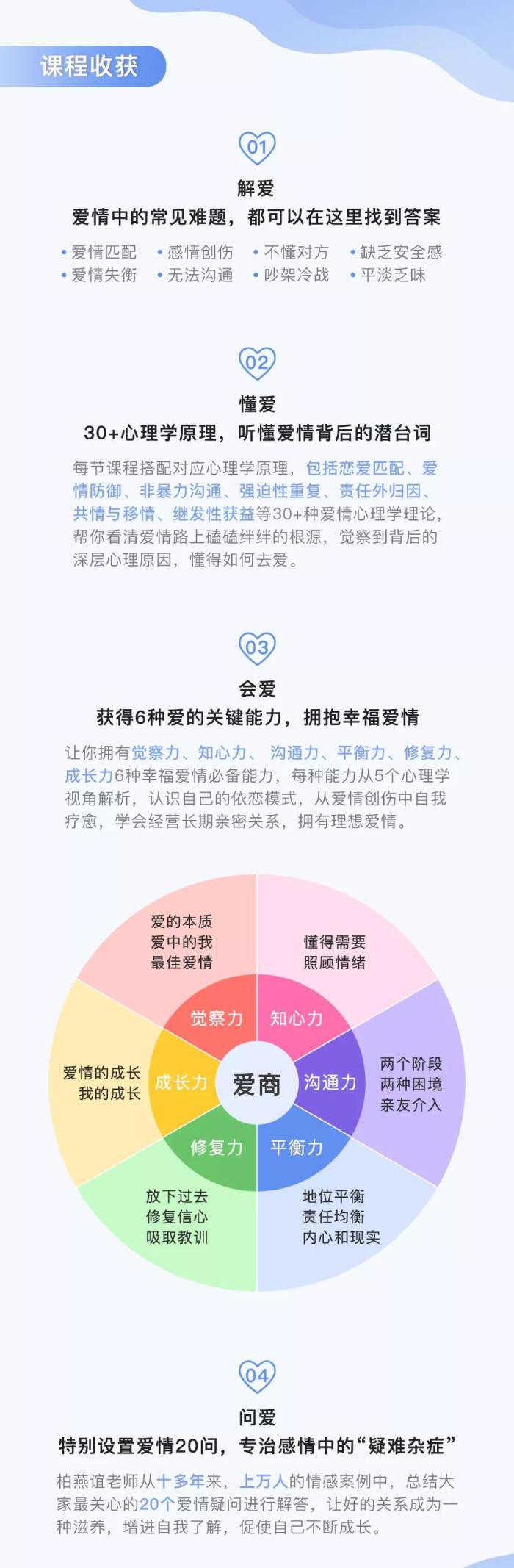 这次,《爱情保卫战》的心理专家、从事心理咨询12年的柏燕谊老师,她将把帮助上万人理清情感问题的经验,结合自身经营10年幸福爱情的心得,浓缩为《30堂爱情必修课 ,解锁幸福爱情的6种能力 》一课,帮你找到爱情最好的模样,和TA一起“一房、两人、三餐、四季”。