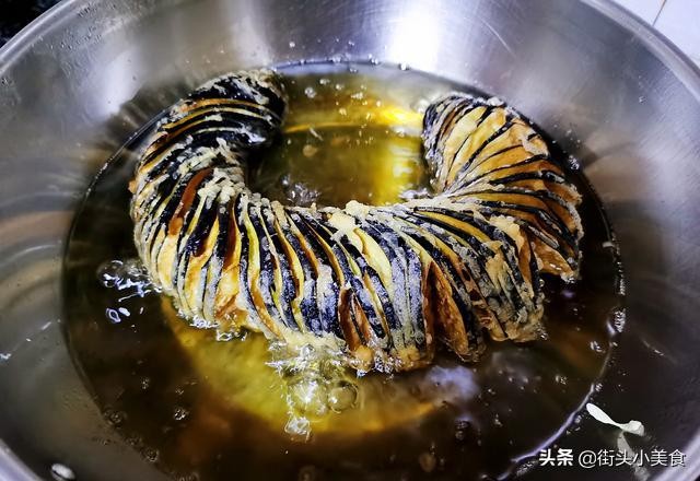 步骤4、起锅锅中放入大量油,待油烧热后,把裹好面糊的茄子放入油锅开始炸制,等茄子炸制外表金黄捞出控油,备用