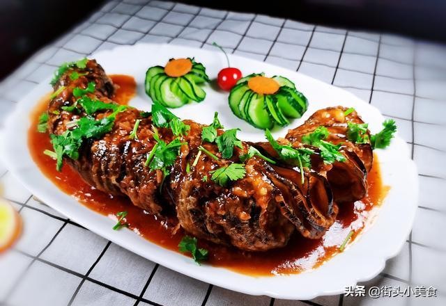 步骤6、把控好油的茄龙摆放在合适的盘中,再把熬好的汤汁均匀地倒在摆好的茄龙上面即可,上桌前撒上少许香菜,就可开吃!