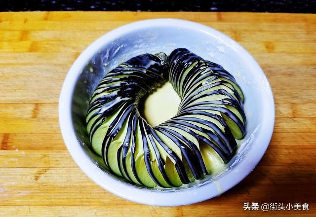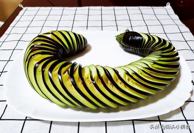 光盘贴士:此菜主要在茄子切蓑衣这步,首先在茄子的一面90度下刀切,不要把茄子切断。然后把茄子翻过来45度下刀,同样也不要切断,如果拿不准,可以用一根筷子紧挨茄子平躺放置即可。