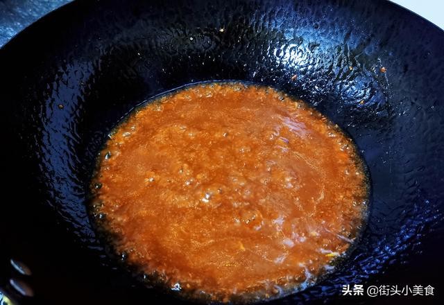 步骤5、锅中留少许油,加入备好的葱、姜、蒜,炒至爆香后,就可以放适量番茄酱、适量食用盐、适量白糖、适量陈醋、适量鸡精和适量清水等煮开后勾入少许水淀粉让汤汁变浓稠即可,备用