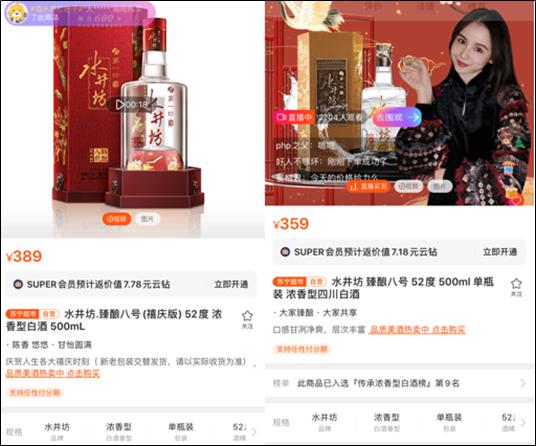 在天猫上水井坊销量最高的店铺为“水井坊官方旗舰店”,52度500ml臻酿八号标价489元,券后到手价为359元。而52度500ml臻酿八号禧庆版在该店中标价为519元,券后到手价为389元。