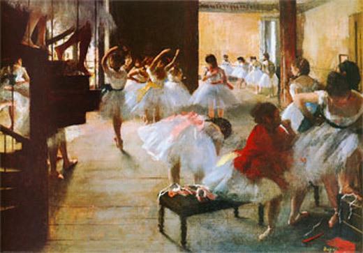 背景:《舞蹈教室》是埃德加·德加于1874年创作的一幅油画。这幅作品描绘了巴黎舞蹈教室芭蕾舞考核的场景。德加没有亲身到场观察,而是根据传说和他对舞女的写生创作了这个紧张繁忙的场面。画面中包括演员、教师和几位着黑衣的妇女,德加通过将排练厅的大镜子放置在画面中央来增强空间感。