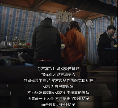 对善宇,则是因为太懂事,所以她安静听他诉说,再分析妈妈的想法给他听,原来并不是懂事就好了,也要理解家人的用心,因为爱一个人不是宽裕了想要给予,而是恳切地必须给予,所以回去揉揉妈妈的肩膀吧。