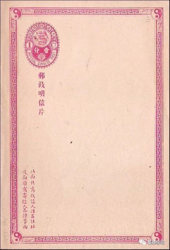 中国最早的明信片应该是在大清邮政局正式开办后于1897年发行的。1897年2月20日(光绪二十三年一月十九日),大清邮政奉旨正式开办。1897年10月1日,由大清国邮政发行的蟠龙图邮资明信片才是中国邮政第一枚邮资明信片。采用中式排版竖式印刷。由日本筑地印刷所印制。邮资图在片的左上角,椭圆形。邮资图的上图是蟠龙图,下是万年青图,中间是资费壹分字样。邮资图上框是“大清国邮政”,下框是英文“IMPERIAL CHINESE POST”。明信片为桃红刷色。明信片尺寸:77毫米×123毫米(横×竖)。片四周有框线,框线四角分别是“太极图”,框线大部分是“回形纹”,靠近“太极图”处是曲线花纹。