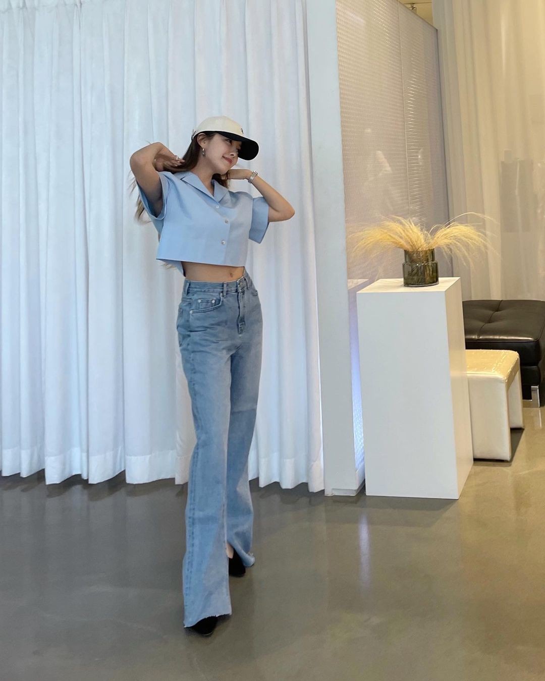 秀智身穿泡泡袖设计的丹宁连身裤,轻松的休闲感分别用深浅色调的帆布鞋与棒球帽堆叠出蓝色系的层次变化,不用多余的饰品装饰也能成为丰富的夏日风格。