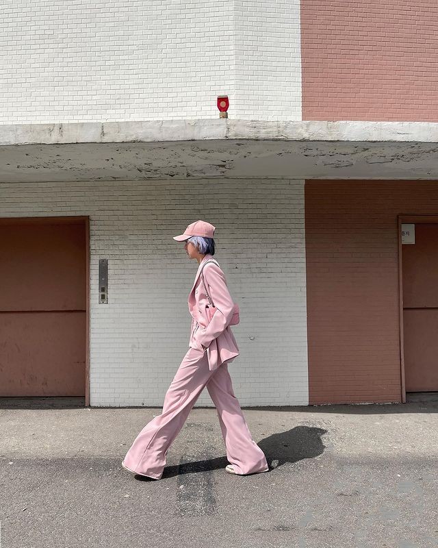 选择和成套西装同色系的棒球帽搭配,除了更有一体性视觉上也显得格外亮眼有型,是高段班潮人等级的时尚技巧。