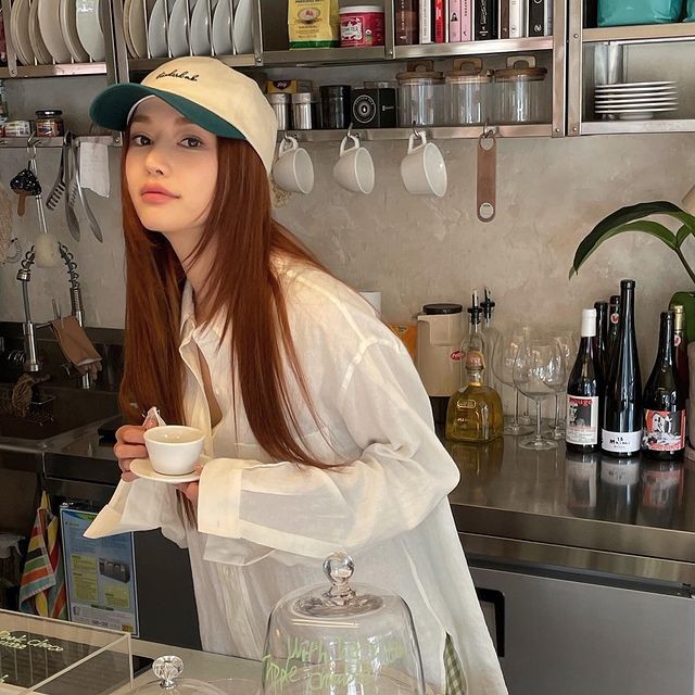 韩国人气名模SORA在宽松的男友衬衫造型上,搭配撞色设计的棒球帽营造不修饰的日常随性,毫不费力的穿搭技巧就能将中性单品化为活泼率性。