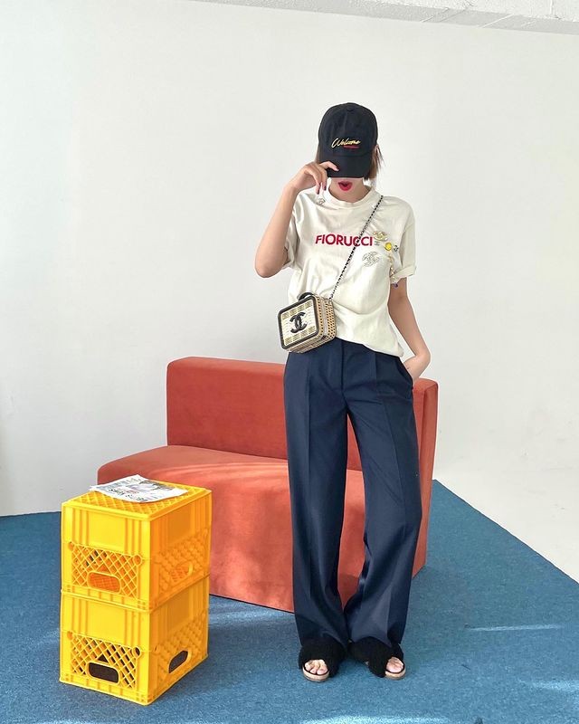 充满高冷时尚魂的高俊熙为了不让宽松西裤显得太过正式,所以搭配休闲棉T与棒球帽,将自然随性巧妙带入,而细节处的小方包与造型拖鞋,很有默契地为造型搭配出亮点。