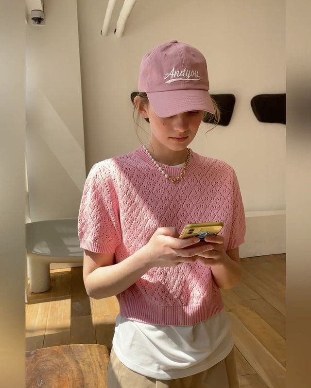 粉色棒球帽与粉嫩薄针织衫甜美呼应,其中再用珍珠项链将优雅与休闲感可爱地结合在一起。