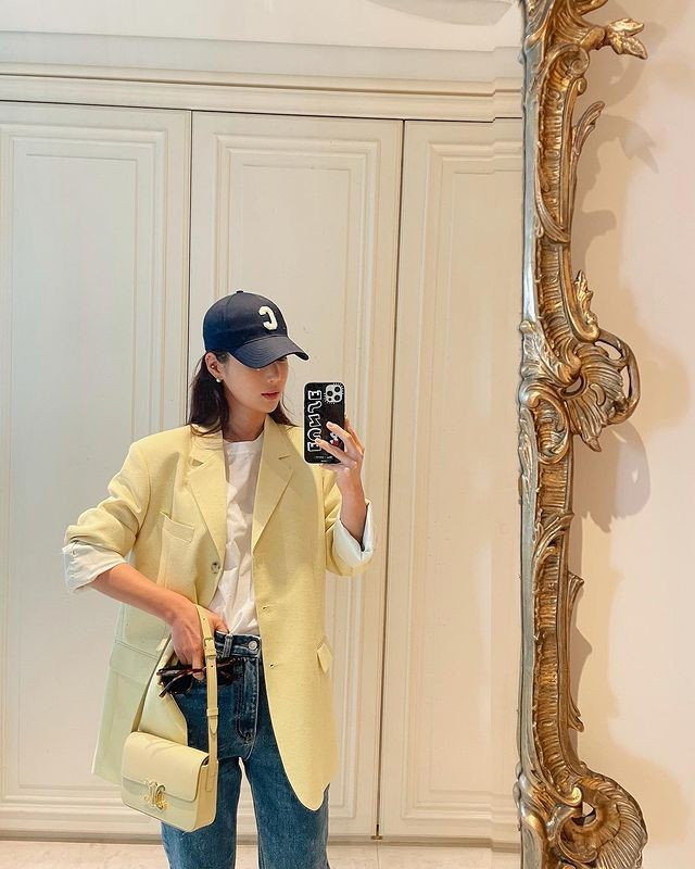 韩国女星奇恩世在众多西装外套中,选择了最有夏天氛围的鹅黄色款式,搭配丹宁搭配白T绝对不出错,头上深蓝色棒球帽则呼应了休闲丹宁的轻便感。