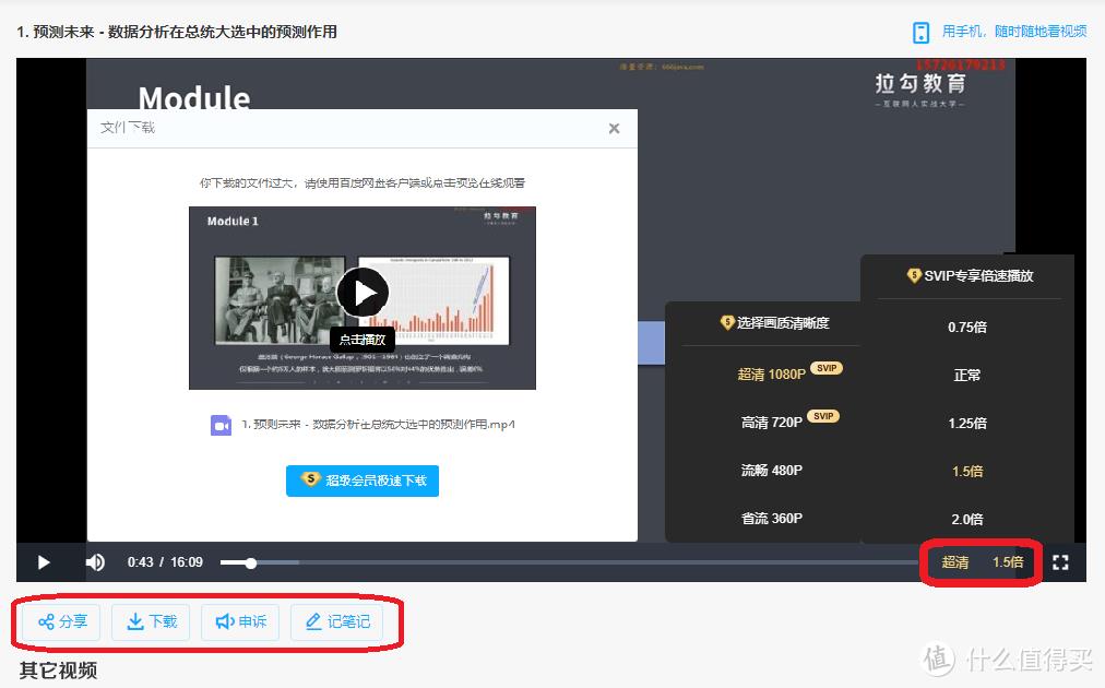 网页版观看视频,支持选择画质清晰度和倍速播放功能,支持分享和下载,需要下载时提示安装百度网盘客户端。另一个好用的功能是关灯模式,关灯后,注意力全部集中在视频上。还可以边看视频边记笔记,内置笔记模板功能,这个功能超级赞,笔记整体框架已搭建好,只需往里填写记录内容,方便那些爱学习的同学。