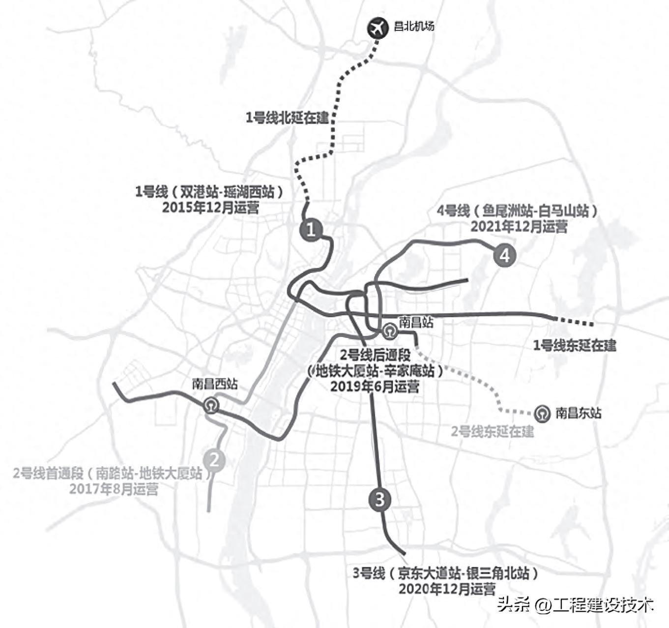 在建线路共三段,分别为1号线北延至昌北机场、东延至麻丘,2号线东延至南昌东站,在建规模总计31.76km,均计划于2025年通车运营。3条延长线路建设完成后,届时南昌轨网规模将达到约160.00km,车站113座(见图1)。