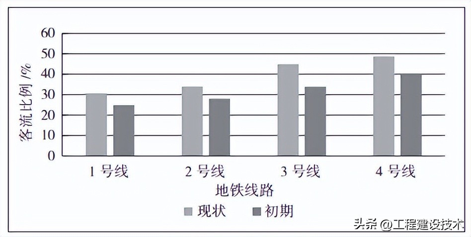 由于既有1~4号线均穿越中央活力区,现状高峰换乘站集中于中央活力区,各线路换乘客流较大。轨道交通环线建成后,外围新增多个换乘站,既有1~4号线换乘比例有明显下降,以轨道交通3号线为例,现状轨道交通客流换乘率为45%,轨道交通环线建成初年,3号线换乘率为34%,下降24%(见图4)。