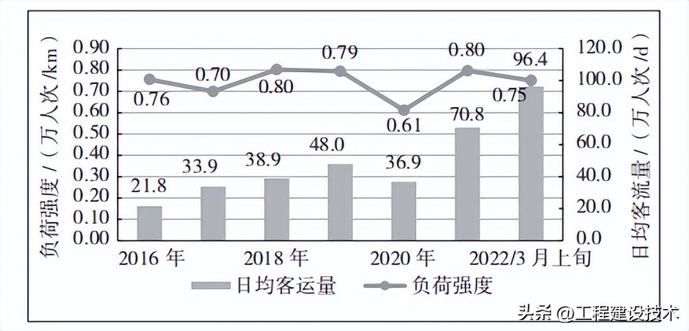 截止到2022年3月上旬(轨道交通3号线开通运营未满2年,轨道交通4号线运营未满半年),全网客运量达到96.4万人次/d,负荷强度达到0.75万人次/km(见图2、表1)。