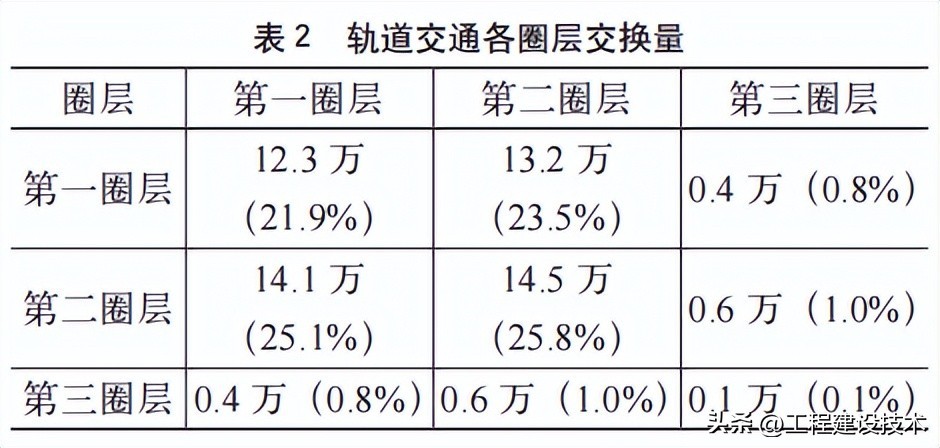根据全市轨道线路站点间OD分析,轨道交通出行主要集中在第一和第二圈层,占全日出行总量的96.3%。分圈层看,第二圈层内部出行占比最高,全日出行量达到14.5万人次,占全日轨道交通出行总量的25.8%,第一和第二圈层之间的交换客流也较为可观,全日双向出行需求可达到27.3万人次/d,接近全日轨道出行总量的50%(见表2)。