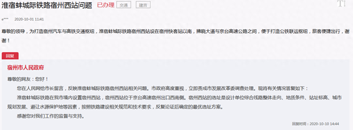 安徽网 大皖客户端讯 近日,宿州市人民政府在人民网”领导留言板“回复网友时表示,淮宿蚌城际铁路在该市境内设置宿州西站,宿州西站位于京台高速宿州出口西南侧。具体如下: