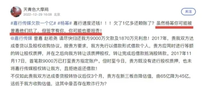 2022年,已经度过经济危机,已经成为行业翘楚的嘉行传媒,竟然传出了欠债一亿的负面报道。