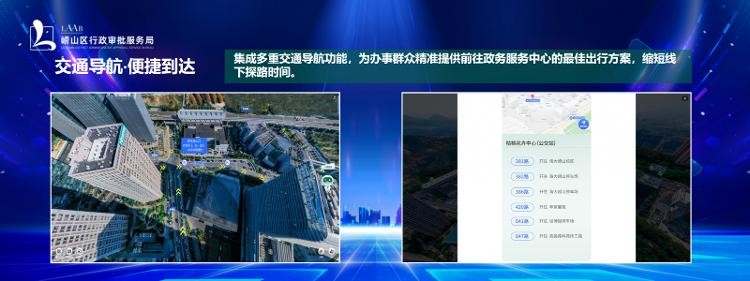 “办事导航”版块结合崂山区政务服务中心周边交通网络,集成各类交通导航资源,针对“自驾”“打车”“地铁”“公交”四种常见出行方式提供实景导航服务,停车场剩余车位信息实时更新,群众可以在高楼林立的青岛国际创新园中更便捷、更准确地找到政务服务中心入口,提前规划出行路线,节约办事时间,到政务大厅办事变得更加轻松自如。