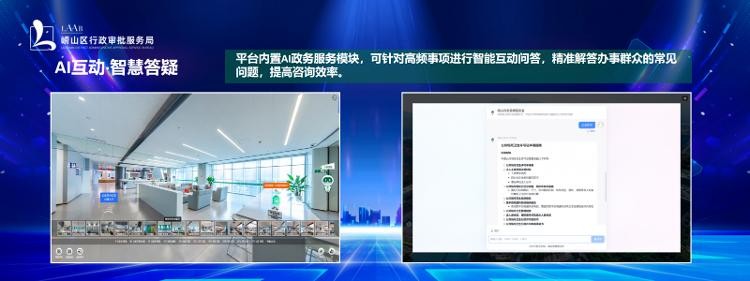 “借助VR技术,我们将政务服务中心1:1映射到三维数字空间,720度实景呈现政务服务中心的地理位置、业务布局、窗口设置等内容,办事群众可随意切换场景直达行政审批、公安、医保等业务区域,身临其境地了解想要办理的事项应该去哪个窗口,避免出现多绕路、排错队、找错楼层的问题。”崂山区行政审批服务局技术服务科负责人高飞向记者介绍道:“在此基础上,我们还应用了AI和数字人技术,通过语音播报方式提供个性化的政策解读和流程讲解,更有智慧‘小易’针对高频事项进行互动问答,提高咨询效率,让群众有更加优质、暖心的政务服务交互体验。”