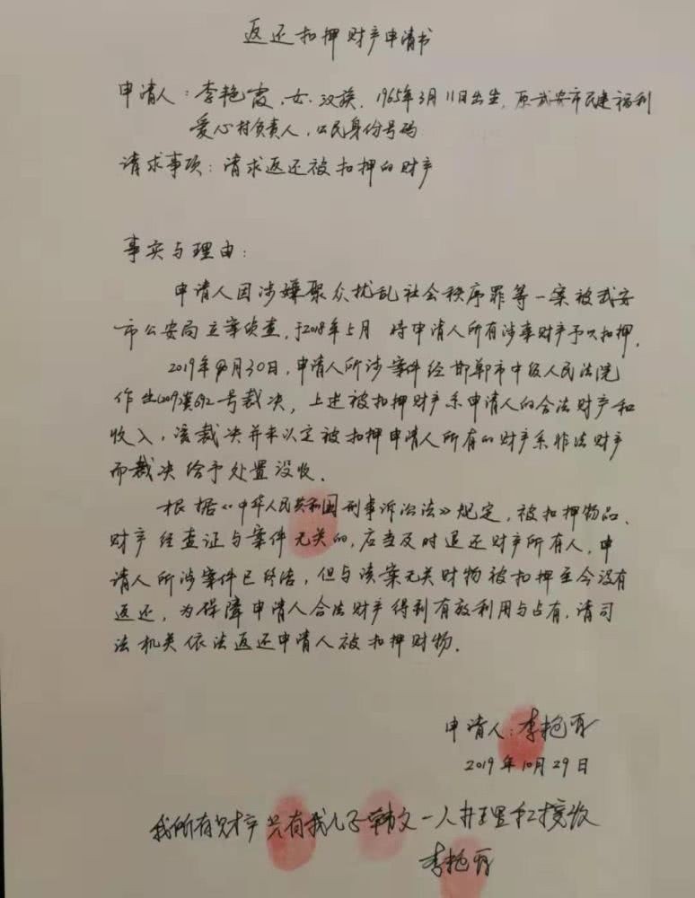 此外,日前,河北“爱心妈妈”李利娟向河北武安市公安局递交《解除扣押冻结申请书》,申请对此前被武安市公安局扣押的相关财物解除查封、扣押、冻结,予以退还。