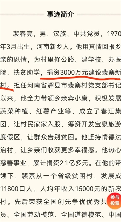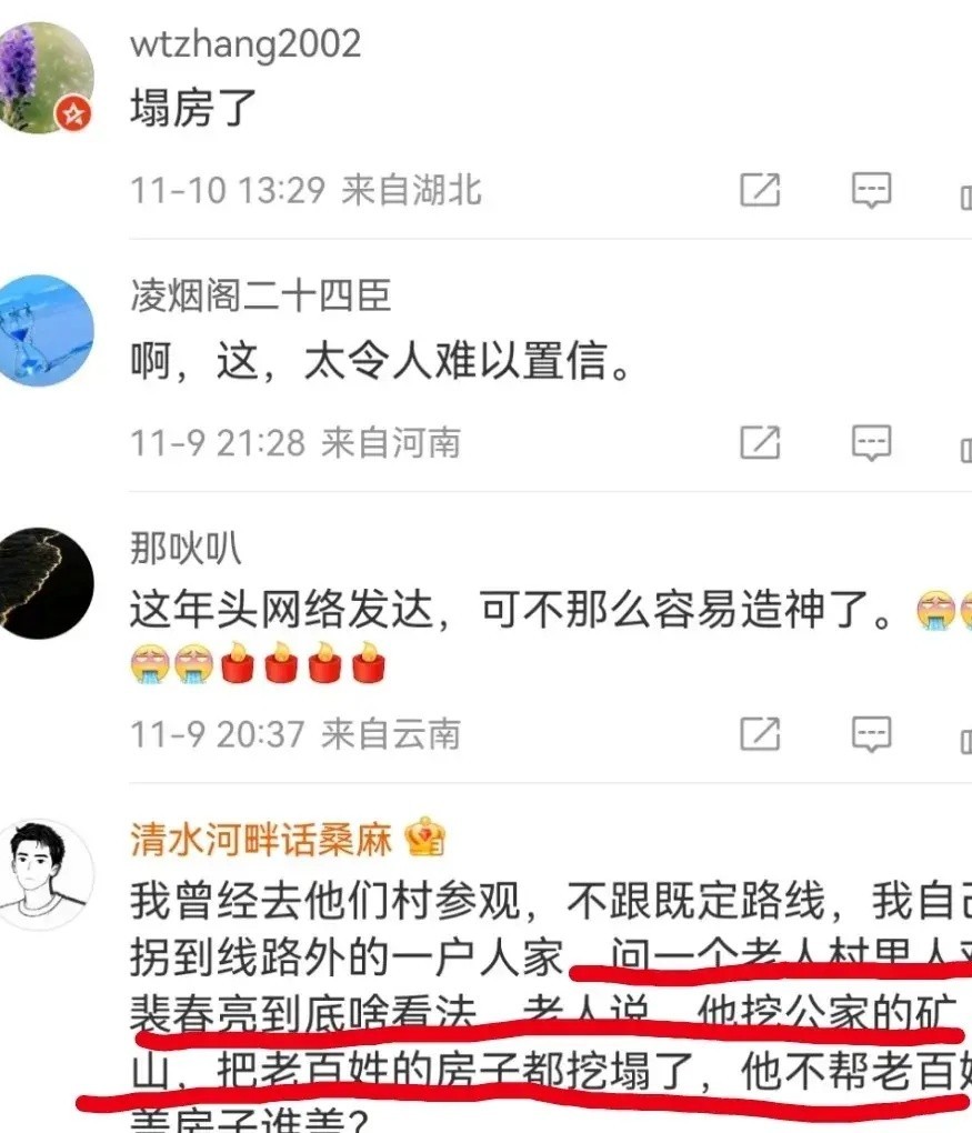 裴春亮曾是乡村振兴的象征,捐资建村、热心公益。他曾为自己的家乡辉县披荆斩棘,赢得了村民的尊敬与赞扬。以他为代表的“最美奋斗者”们,是无数人心中梦想与奋进的象征。荣誉带来的光环,并没有持续太久。随着近年的调查曝光,裴春亮被指控涉嫌多项违纪行为,甚至涉嫌“挖公家矿山、损害百姓利益”的争议。