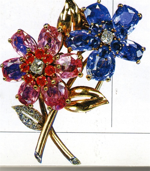 这枚胸针由两朵粉色和蓝色的花朵组成,蓝色花朵由六颗椭圆形蓝宝石和五颗方形切割蓝宝石围绕钻石中心展开。粉色花朵也按照此规则组成,茎和叶是金的,其中一叶上还镶满了钻石,胸针整体少女心十足。