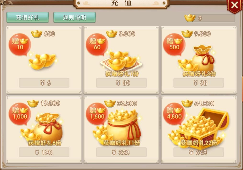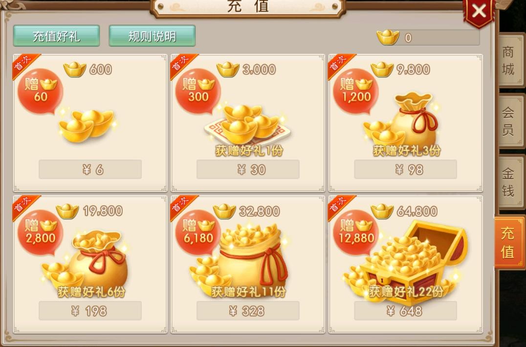 说到金元宝,首先得说充值汇率,充值1元可以得100金元宝,当然了,最低是6元起,分别是6,30,98,198,328,648,但是还有额外赠送的金元宝,充的越多送的越多(看好自己荷包)