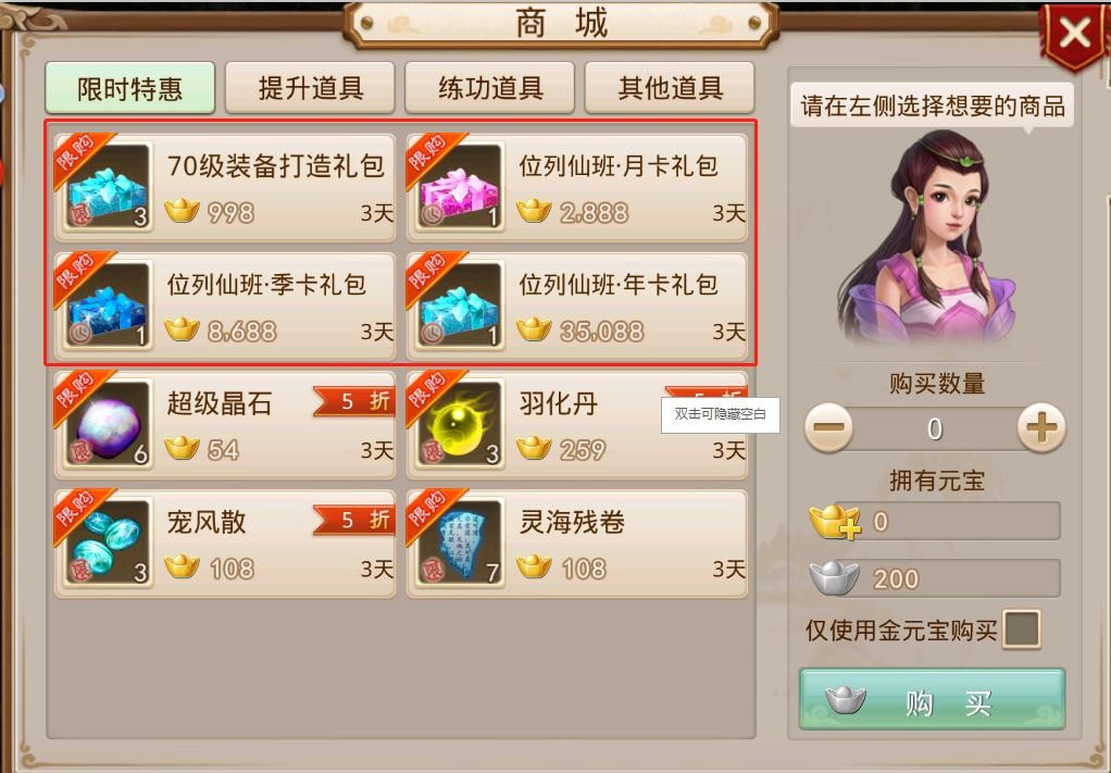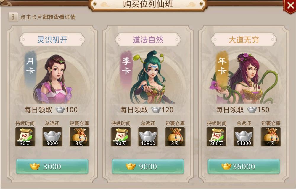 每次大区开区都有一个烦恼,但是别着急,你可以先购买会员,就免去排队的烦恼,这个会员分别分为月卡,季卡,还有年卡。月卡开通3000金元宝,季卡900金元宝,年卡36000金元宝