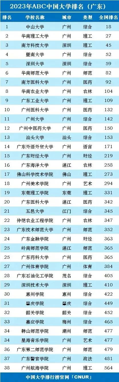 在2023年ABC中国大学排名中,广东省共有38所高校上榜。中山大学在全省和全国的排名都位列第一,分别占据第1和第18的位置。华南理工大学则紧随其后,位居第二,同时在全国排名第27。南方科技大学作为新兴的研究型大学,也取得了不错的成绩,位于全省第三、全国第四十五位。