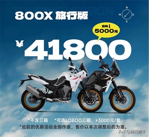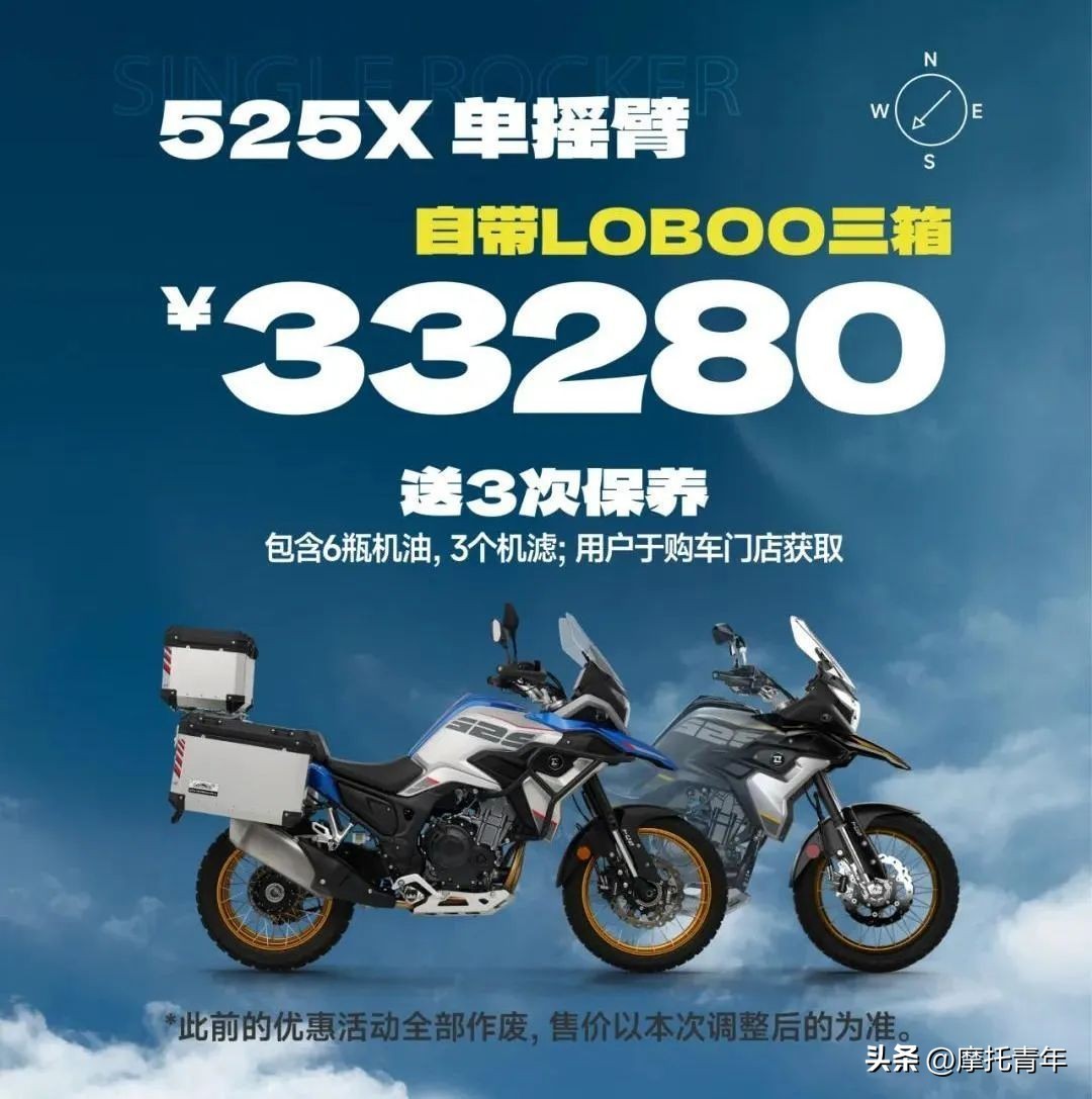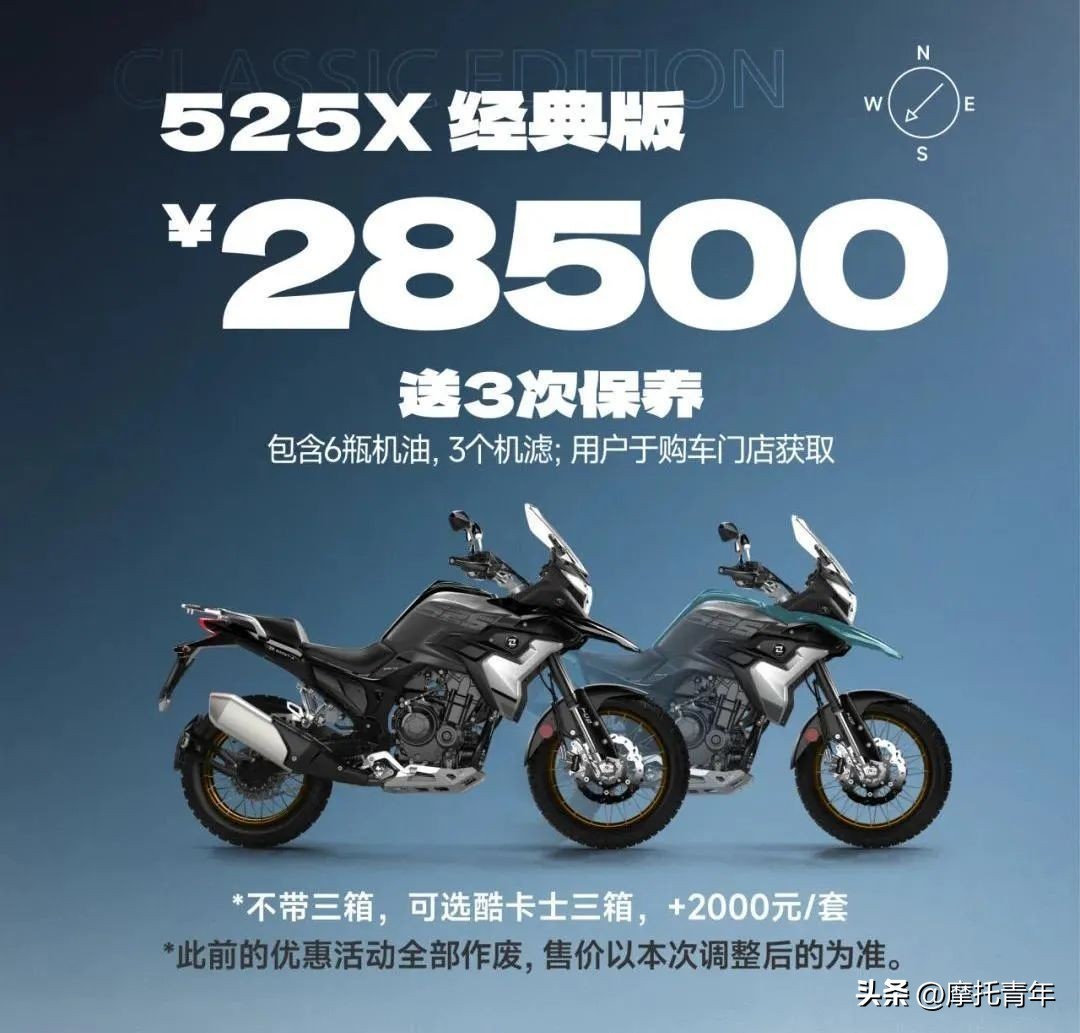 800X旅行版降价五千,售价41800元,525X经典款(不带三箱)售价28500元,单摇臂版(带三箱)售价33280元,送三次保养,其中有六瓶机油、三个机滤,这次凯越可以说在摩旅热兴起之前直接开大了,拿出自家比较热门的两款车型,再加上凯越布置的售后和驿站,确实是个不错的选择。