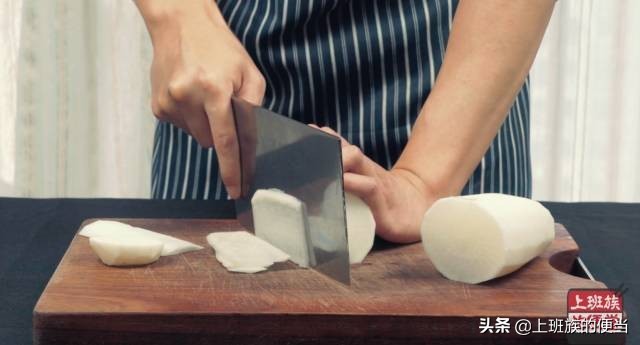 ▲萝卜去皮后切片,把片码放在一起后切丝;