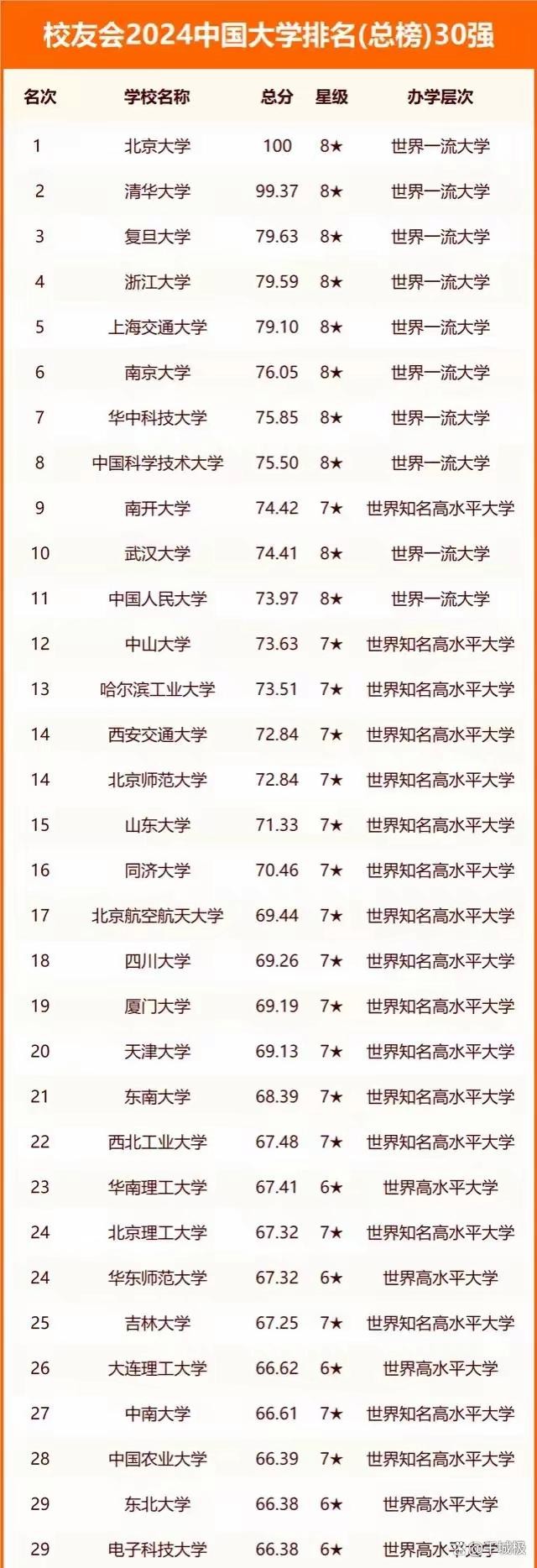 强大的综合实力也依赖于强悍的高等教育,毕竟人才素质和数量是竞争力的根本,而这依赖于众多大学的人才培养能力。在众多中,前30强大学无疑是我国高等教育事业的引领者。按照校友会2024中国大学排名30强,我国30强大学已全部出炉,其中前10依次为:北京大学、清华大学、复旦大学、浙江大学、上海交通大学、南京大学、华中科技大学、中国科学技术大学、南开大学、武汉大学。南开大学、武汉大学均入围前10,东北强校吉林大学位居第25,电子科技大学排名最后。