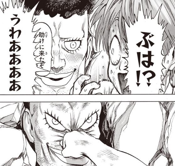 这一话整体的发展趋势并不是很好,目前在场上可以行动的S级英雄基本上全都GG了崩盘退场了,虽然说球棒成功赶到了现场,而且也清理了一波黑精的杂兵,但实际效果并不是很好,不过球棒最大的功劳就是借此机会发现了KING也在现场。