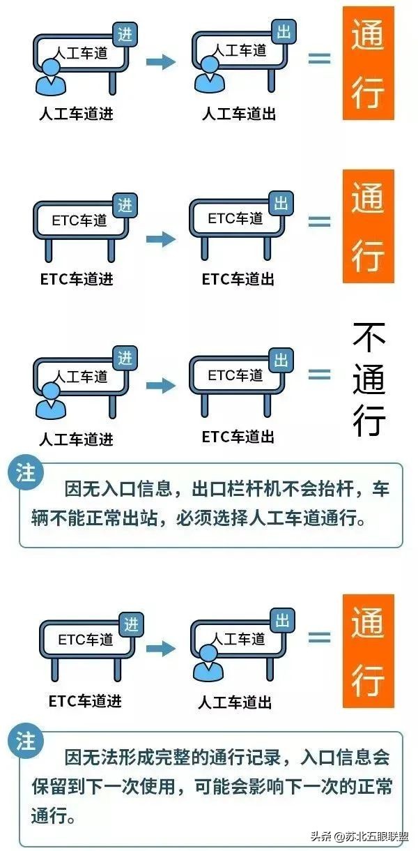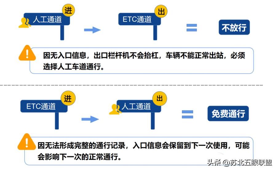 走人工通道上高速的,不建议在ETC车道下高速。建议各位车主尽量选择同一类型车道(即在哪个通道上的就在哪个通道下),以免造成不必要的麻烦,尤其是ETC车辆。