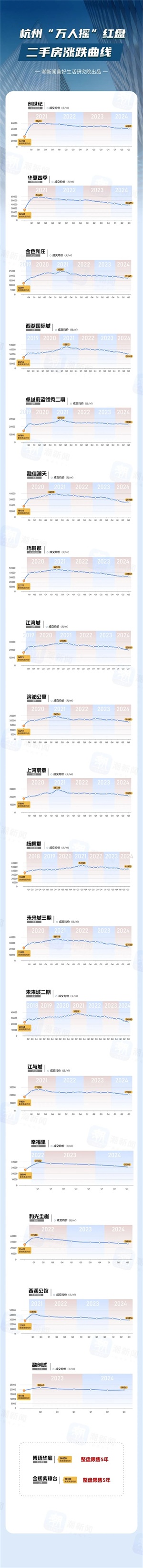 事实上,西湖国际城只是“万人摇”红盘的一个缩影。潮新闻美好生活研究院整理了数据,以季度为单位,绘制了“万人摇”红盘二手房的价格曲线。